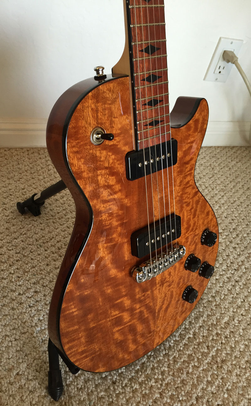 Maple TopThis is the traditional Maple on Mahogany body build. Tried and true. Edits can be made to the fingerboard (RW v. Ebony) and neck to achieve the right fit for any player and style.Paduak TopOur favorite tonewood! The difference from maple is that it's an oilier wood and has a slightly different EQ response. It's very hard like maple, but has a greasier top end combined with a strong midrange. Makes for a great rock tone without mudding out. Works great with humbuckers and destroys with P90'sRedwood TopRedwood is not for everyone. It's a little more delicate than the hardwoods above and has amazing string seperation (no muddy crossover), perfect for complex voices and clean styles. From an EQ perspective, it's scooped with a woody (almost upright quality) bass response and a sweet, high end, not snappy like maple, a softer attack with strong resonance and perfect balance with the low. It is absolutely perfect for fingerstyle players who are adept at point/counterpoint and walking bass lines.*All lumber options are available (granted it's ethically harvested), and we would be happy to accomodate custom builds. |